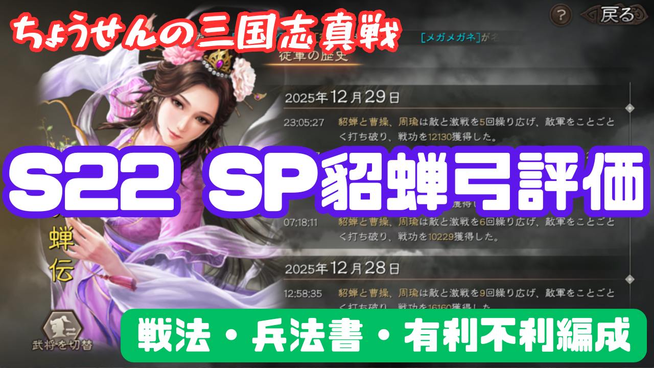 #511【貂蝉の三国志真戦】 S22 SP貂蝉弓評価 戦法・兵法書・有利不利編成 【三国志战略版】