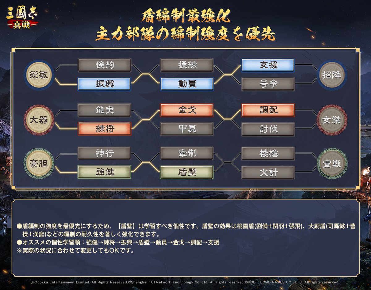 虎衛盾の曹操や法正三勢陣の法正につけていくつの治療効果を提供できるとても手応えのある反撃サポート戦法だと思います。