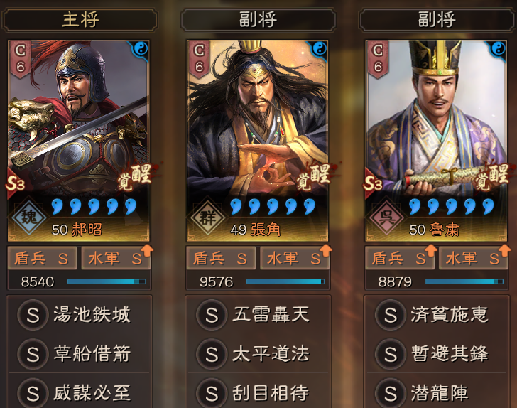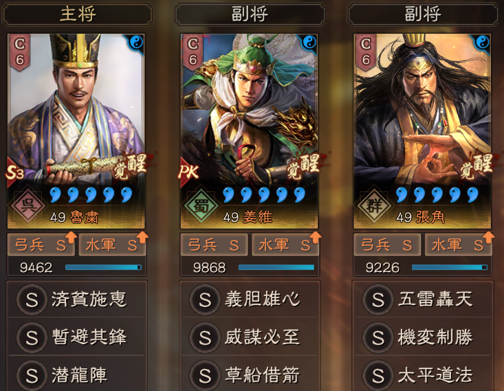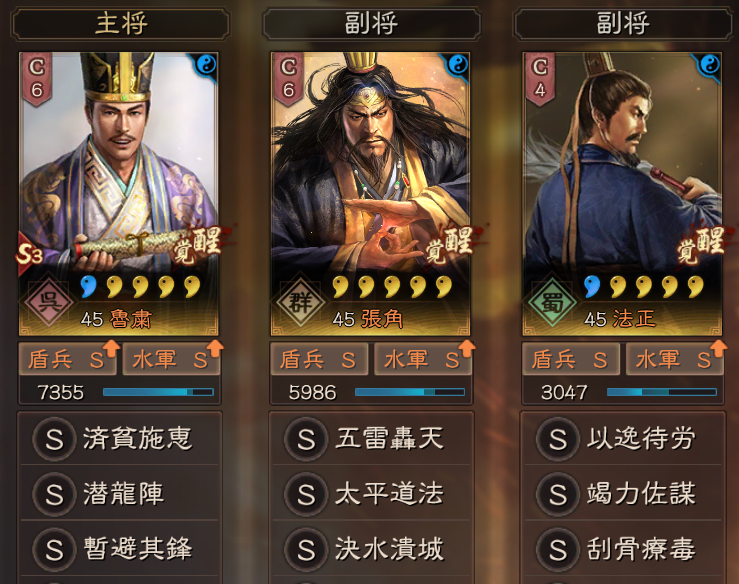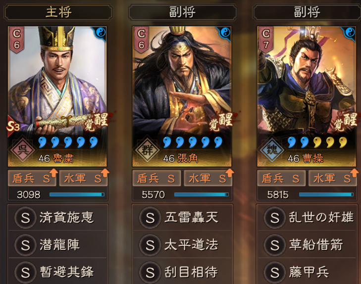部隊強度が高い潜龍陣はいくつかありますが、魯粛が入った潜龍陣が上位に来る傾向にあります。ここでは、姜維・張角を合わせていますが、曹操や諸葛亮、賈詡などとも組み合わせることができるため、自身が持っている凸数が高い武将に合わせて選択することができます。