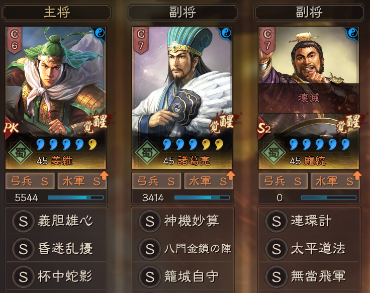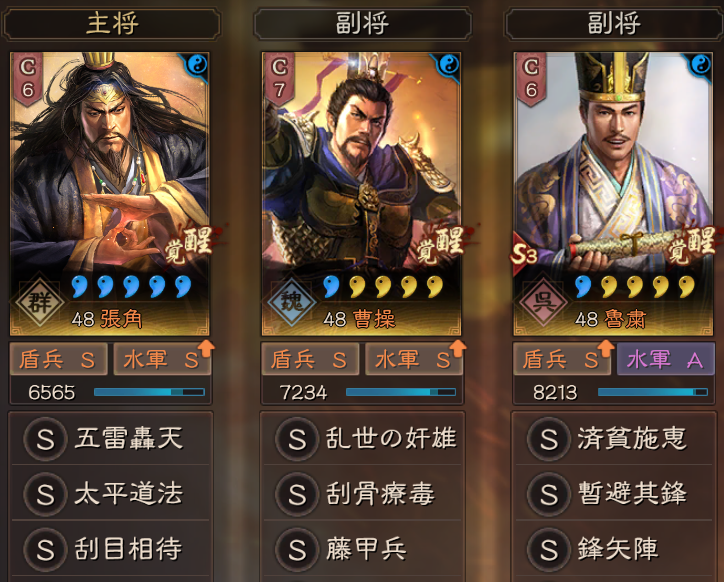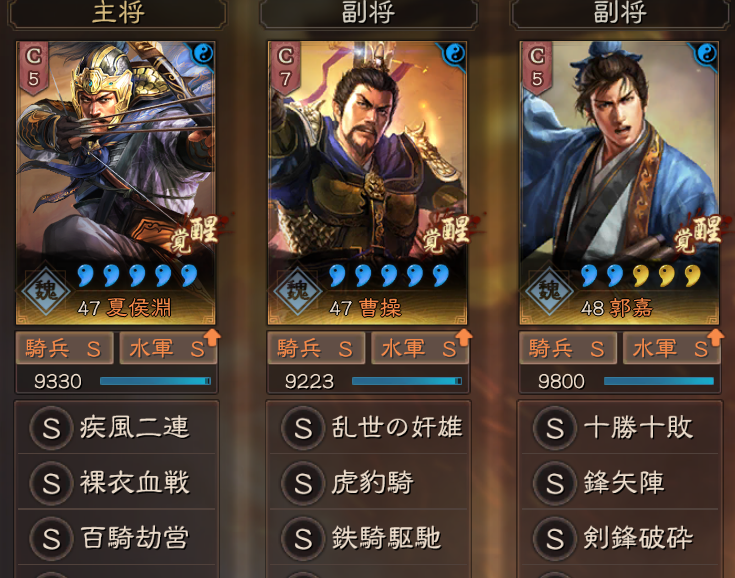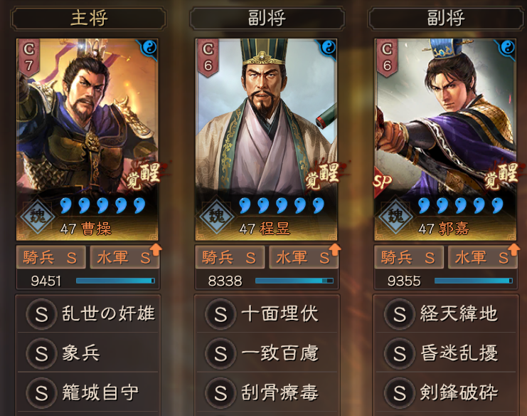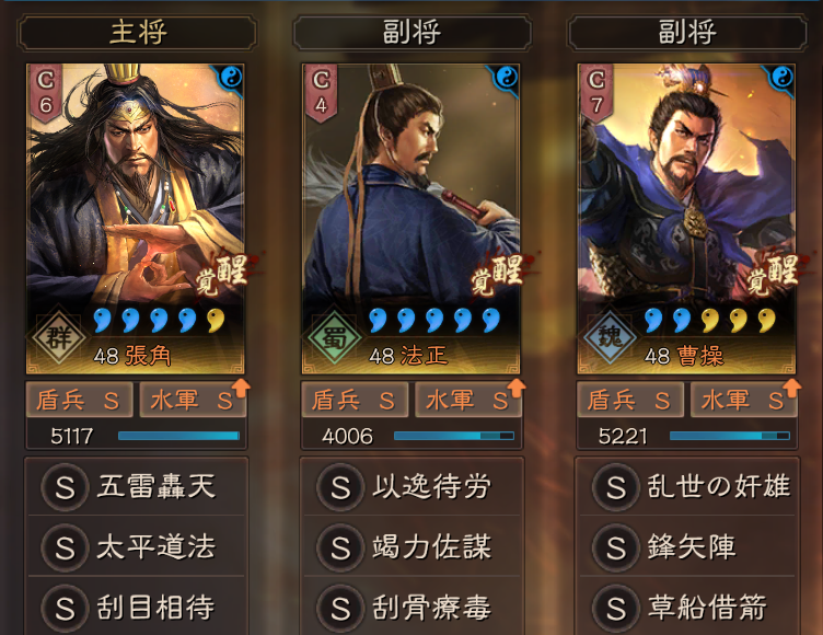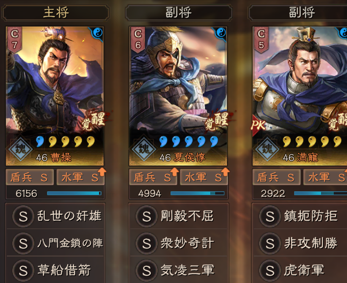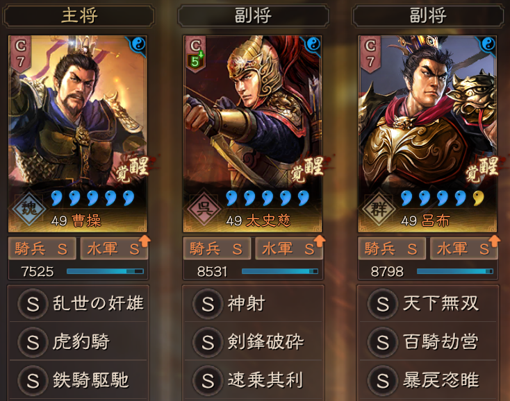 曹操をこの編成に費やせるのかは賛否分かれるところですが、一撃離脱性能が高く、思った以上の戦果をあげることができる編成です。