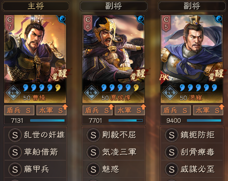 曹操天公盾も一時代を築いた超優秀編成でしたが、最近の新武将、新戦法の登場でだいぶ数を減らしています。