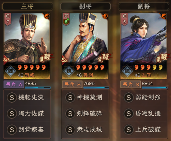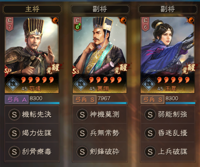 SP郭嘉の代わりに王異がはいることで、弓宝玉が1つで完全体となるほか、SP郭嘉の時のようなアクティブ戦法と突撃戦法の縛りがなくなるため、指揮戦法・パッシブ戦法などを組み合わせることができるようになります。