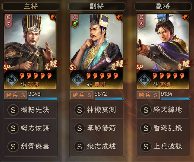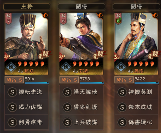 賈詡の戦法は比較的、いろいろなパターンがあり、草船借箭・衆志成城・偽書疑心・剣鋒破砕・兵無常勢など、様々なタイプが合います。