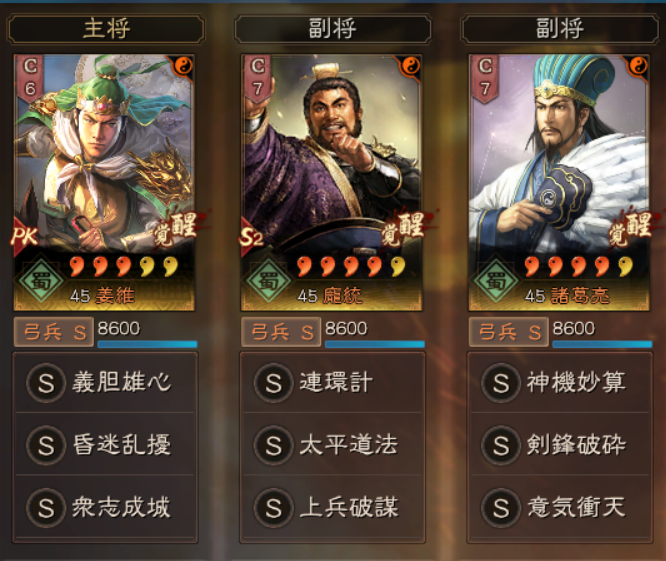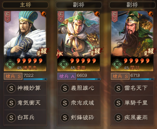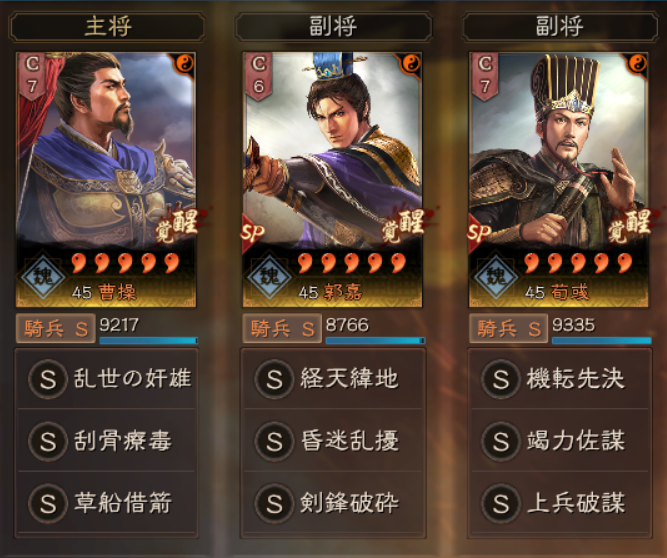 今期は、敵軍にも皇馬槍が非常に多いこともあり、万軍奪帥を標準で積んだものが多い印象です。