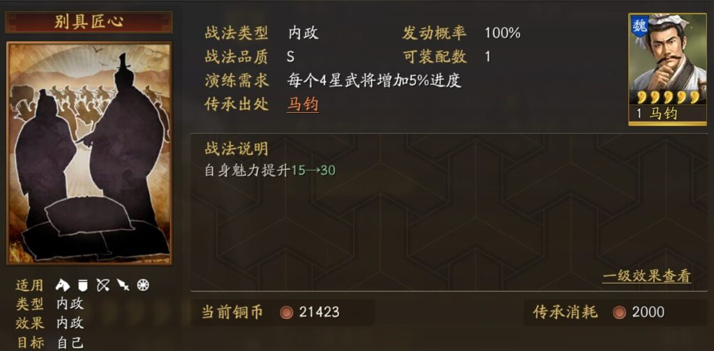 継承:戦闘2-6ターンの間、毎ターン50%の確率(統率の影響を受ける)で自軍複数(2-3人)が1回防御効果を獲得し、遮蔽状態になる。(遮蔽:防御効果が重ねがけ可能になり、8ターン持続する)2ターン持続する。