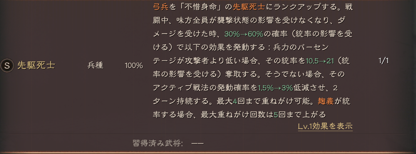 戦闘中、味方全員が襲撃状態の影響を受けなくなり、ダメージを受けた時、60%の確率(統率の影響を受ける)で以下の効果を発動する。