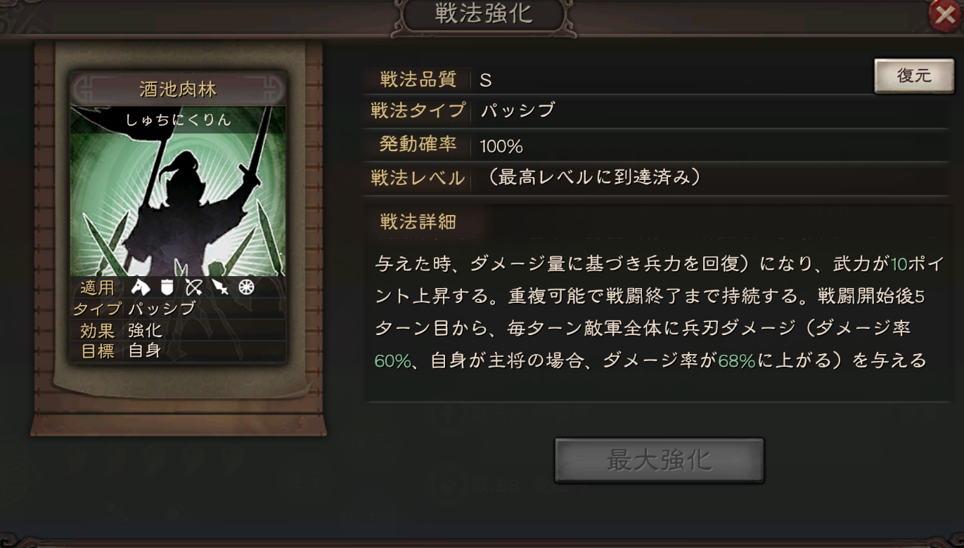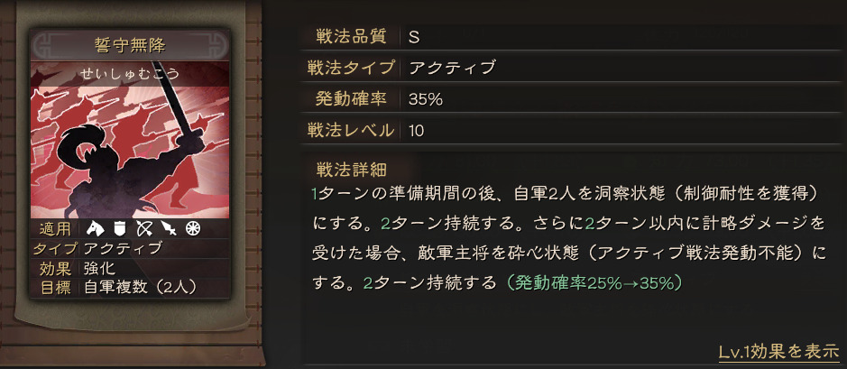 重複可能で戦闘終了まで持続する。戦闘開始5ターン目から、毎ターン敵軍全体に兵刃ダメージ(ダメージ率60%、自身が主将の場合、ダメージ率が68%に挙がる)を与える。