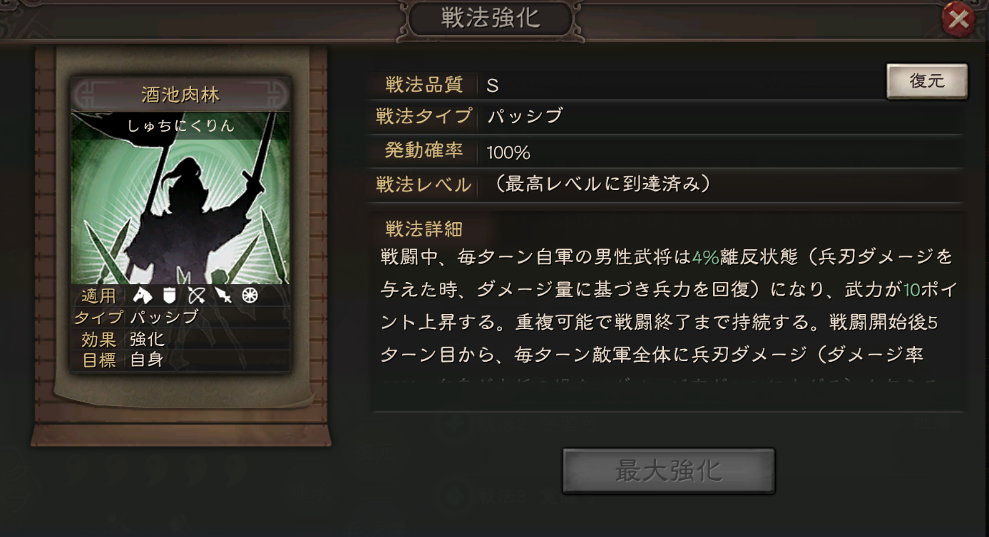 戦闘中、毎ターン自軍の男性武将は4%の離反状態(兵刃ダメージを与えた時、ダメージ量に基づき兵力を回復)になり、武力が10ポイント上昇する。