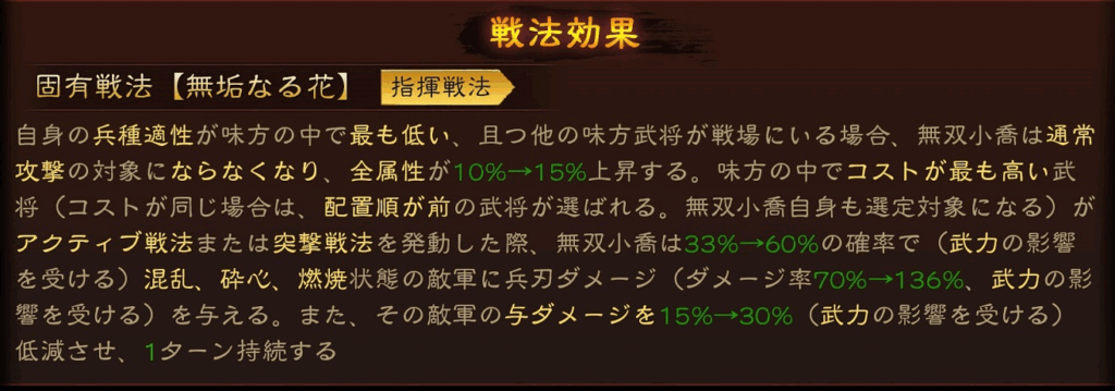 自身の兵種適正が味方の中で最も低い、かつ他の味方武将が戦場にいる場合、無双小喬は通常攻撃の対象にならなくなり、全属性が15%上昇する。