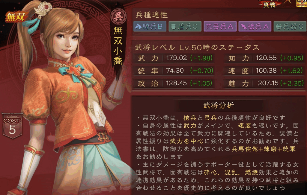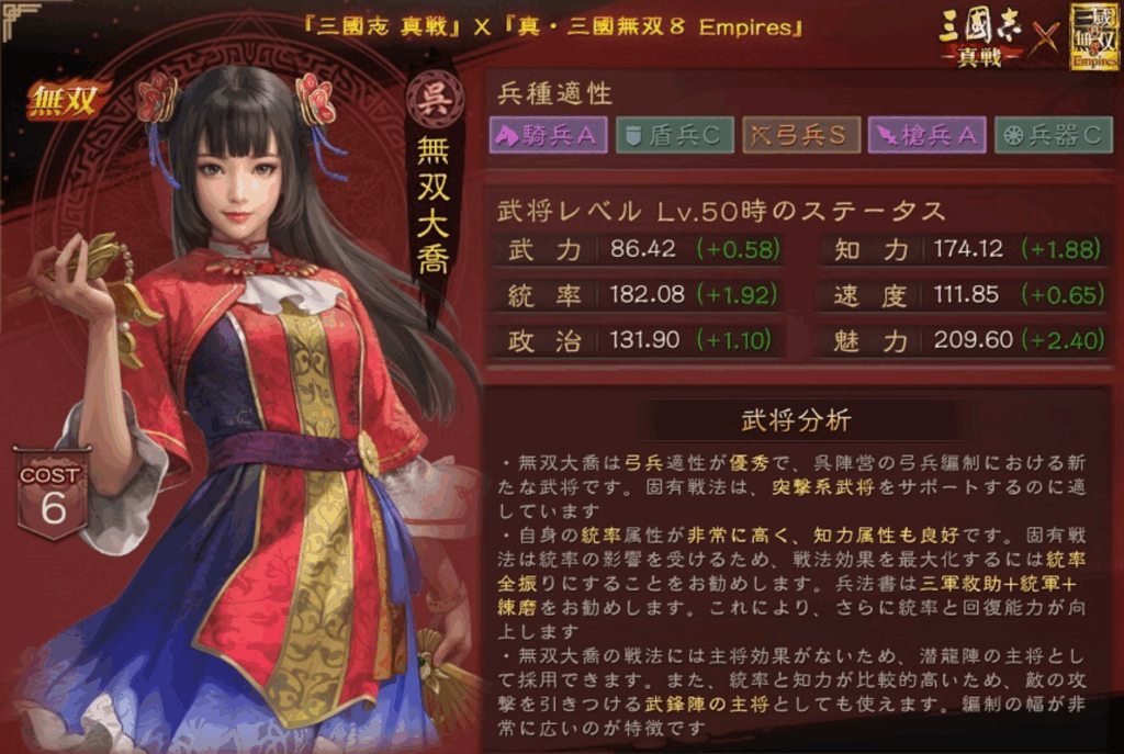 無双大喬は、弓兵種適正がS、騎馬、槍兵種の適性がAとなっており、コストも6になっています。