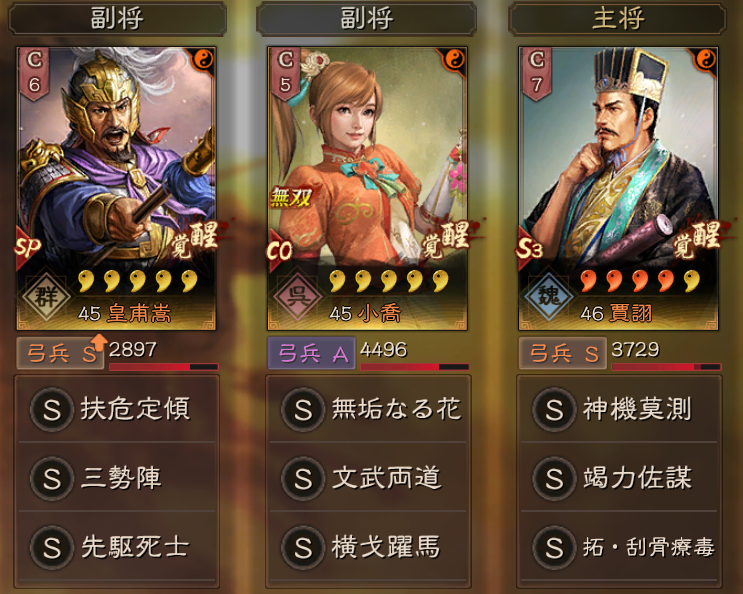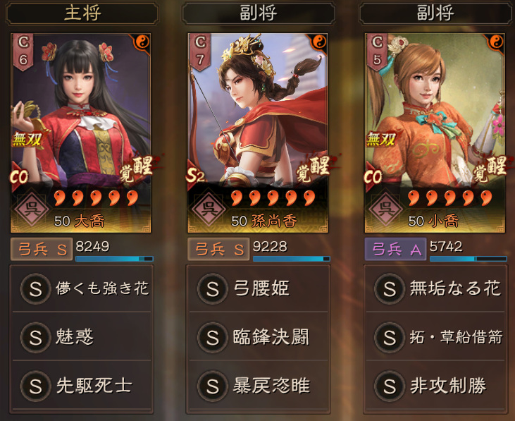 無双大喬は、先駆死士や魅惑をセットする形が多く、制御効果を補う戦法にすると相性が良いようです。