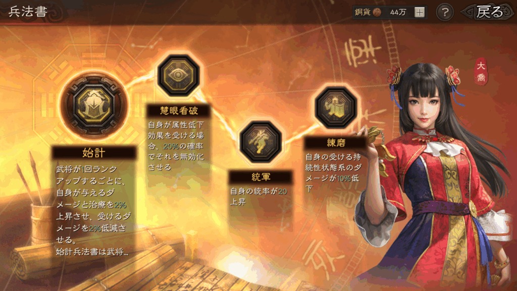 無双大喬には、慧眼看破をセットし、属性低下を受けた場合、それを20%の確率で無効化するという兵法書を選択する場合もあります。
