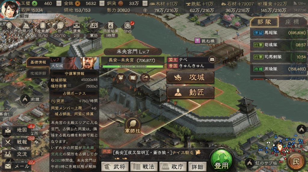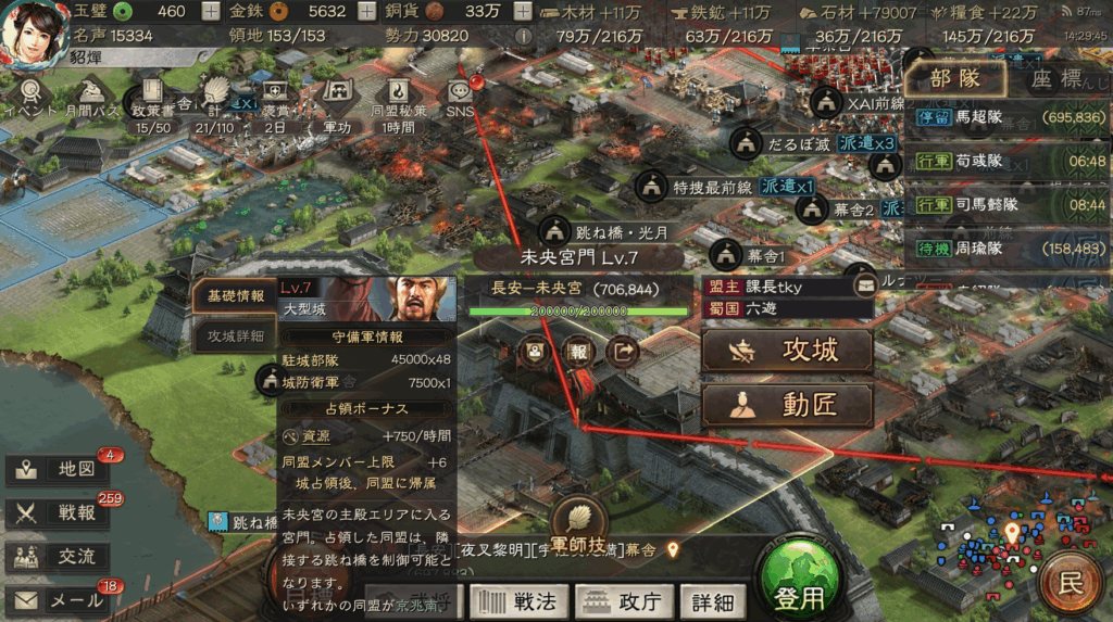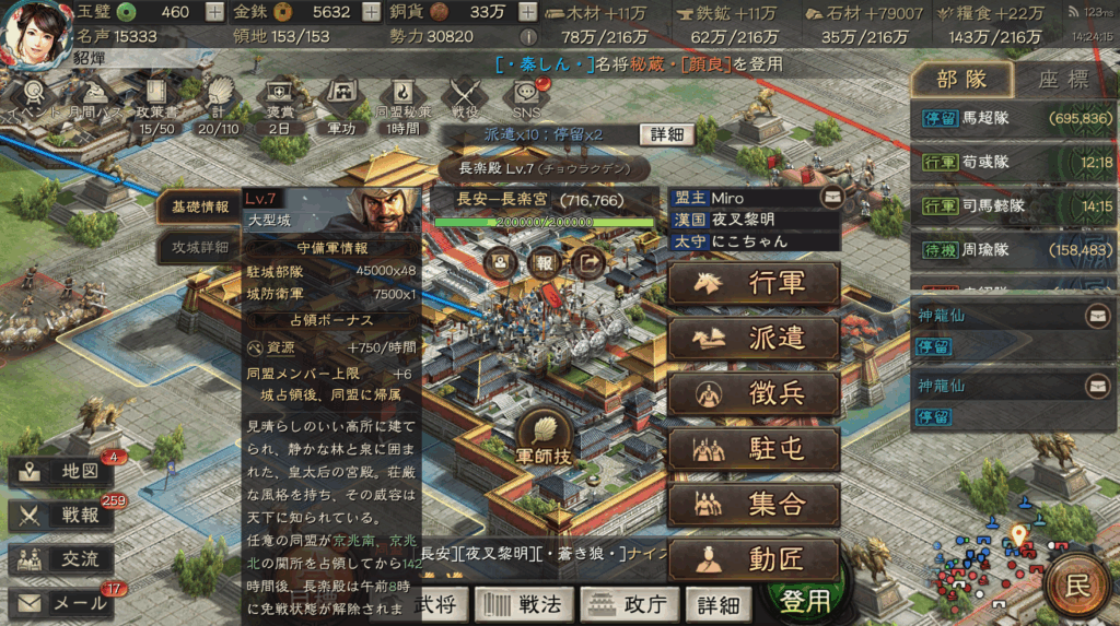 現在は、クールタイムがあるため、出生州から、中央の長安に向かって部隊を派遣しています。