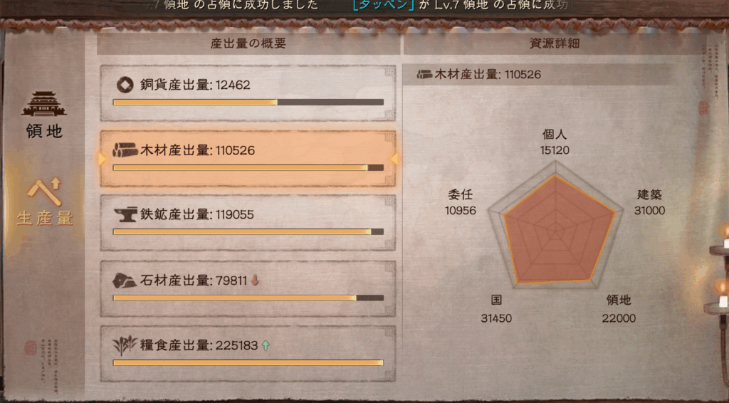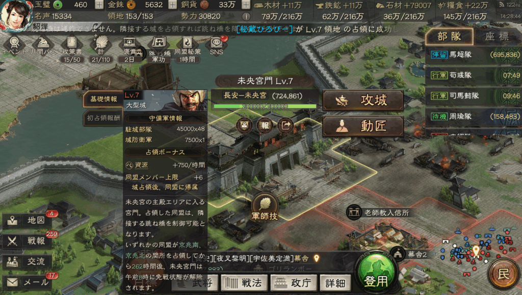 資源については、木材が11万、鉄鉱が12万、石材が8万、糧食が23万となっており、かなり戦闘に特化した資源時給にしてあります。