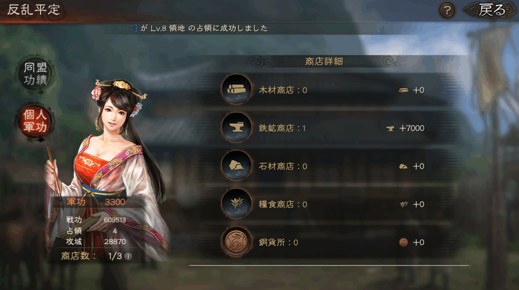 個人の軍功は3000を少し超えたあたりで、戦功は60万を超えたところです。