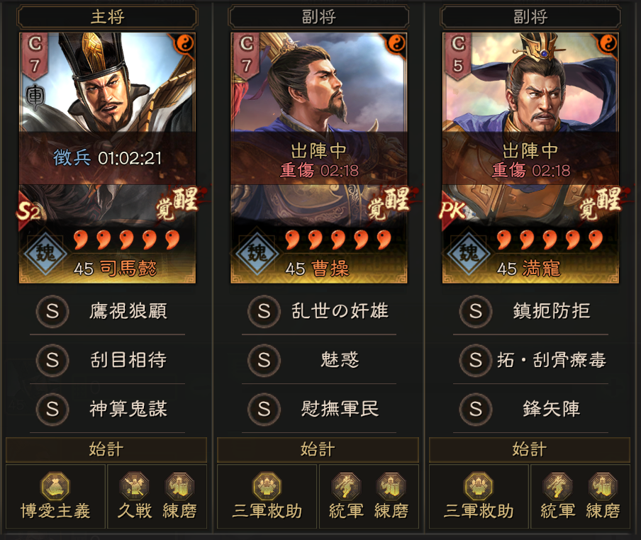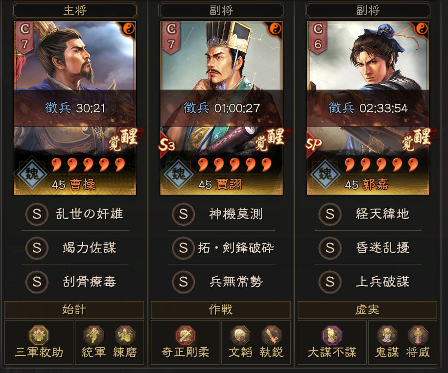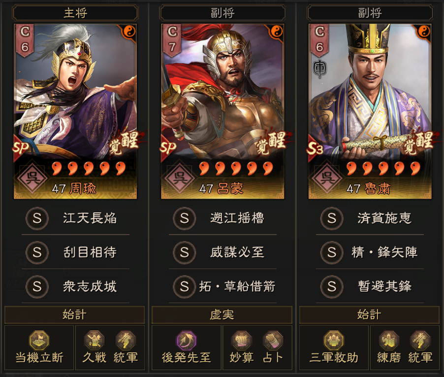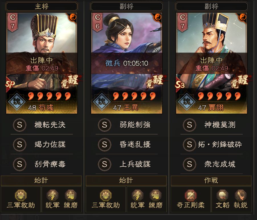 あとで、レベリングが終わってから、王異の昏迷乱擾と文武両道を入れ替えて、周瑜にセットする予定です。