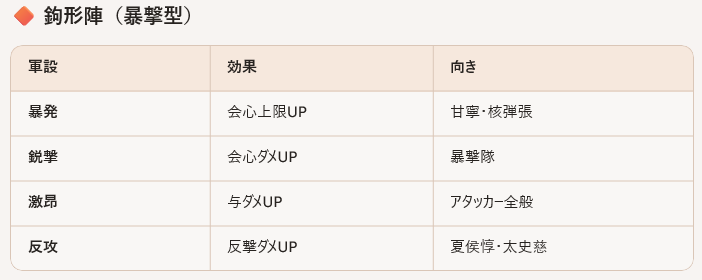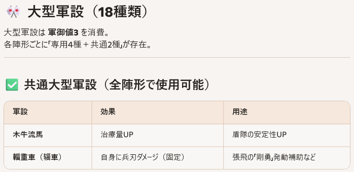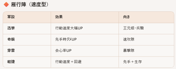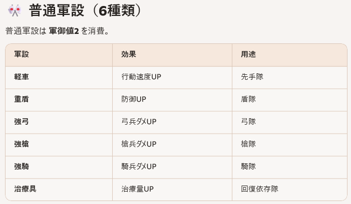 また、普通軍設から、強槍で槍兵のダメージアップや、軽車で速度アップ、迅撃で速度アップなど、ユーザーによっていろいろな選択肢がありそうです。