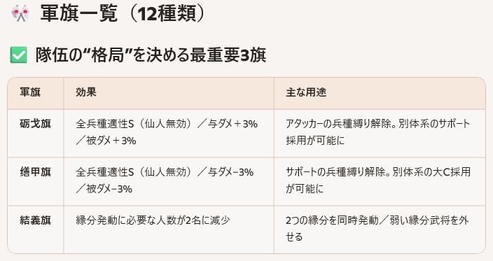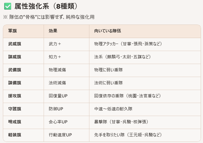 まず、軍旗は、武威旗をセットすることで、武力アップ効果が得られます。