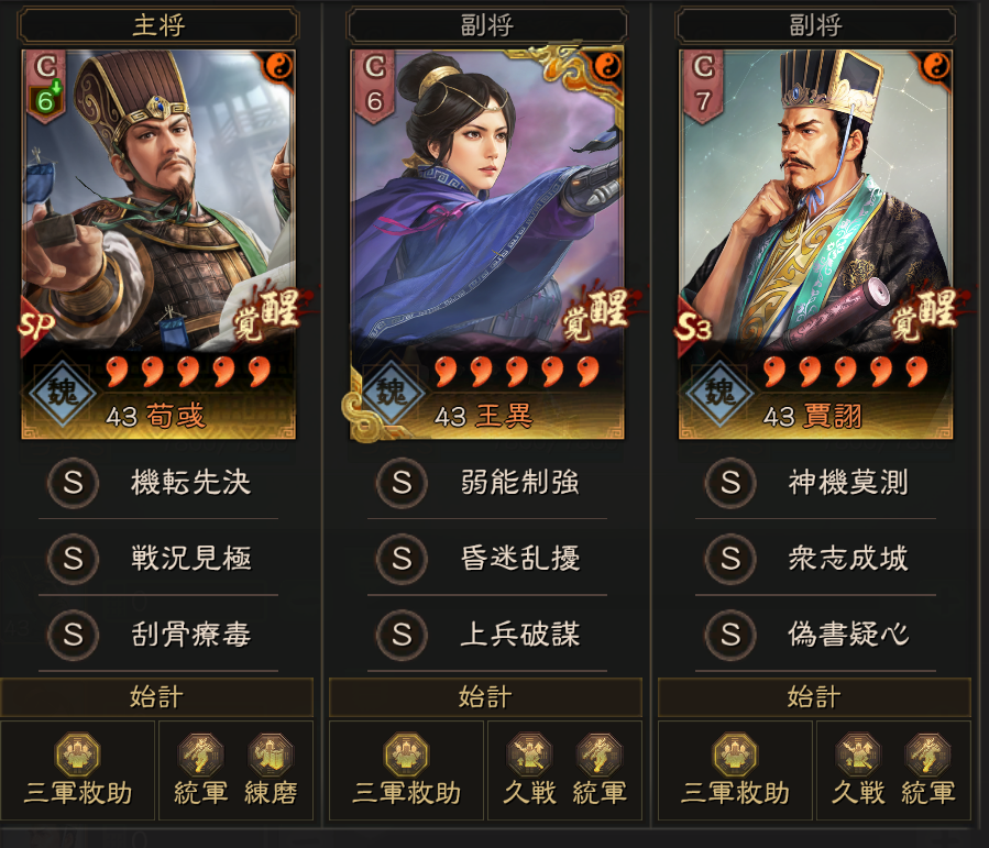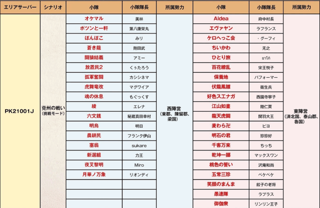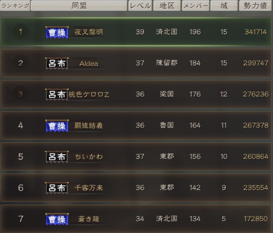 曹操陣営は、夜叉黎明、闘猿結義、蒼き龍、月華ノ万象、六文銭あたりが比較的大きな同盟です。