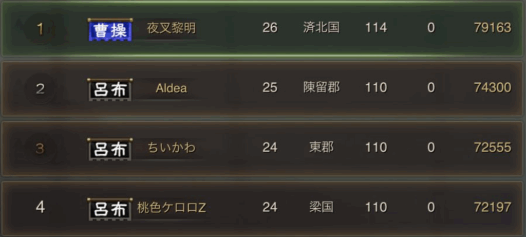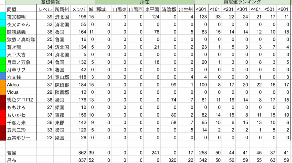 そして、曹操陣営は予想通り、夜叉黎明に偏っていますが、呂布陣営は千客万来、ちいかわ、桃色ケロロZ、Aldeaの4つの同盟がそれぞれ貢献度ランキングの上位に複数名が在籍しており、バランスタイプの陣営であることが分かります。