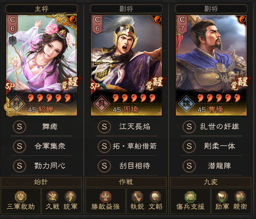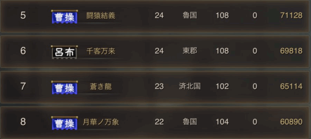 5位以降は、闘猿結義、千客万来、蒼き龍、月下ノ万象という並びになり、曹操陣営が多くなっています。