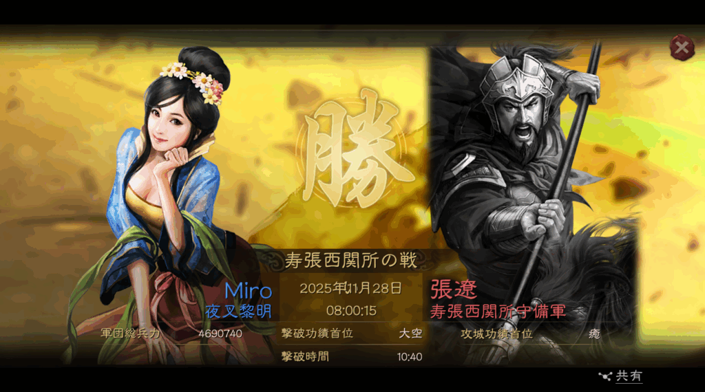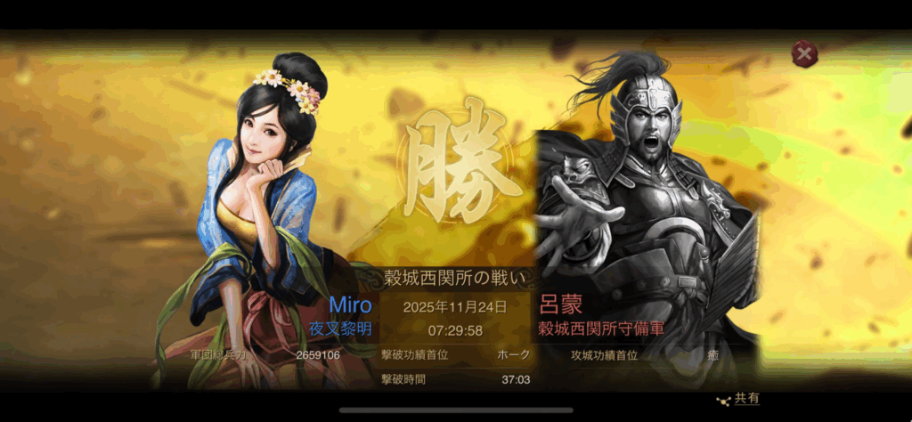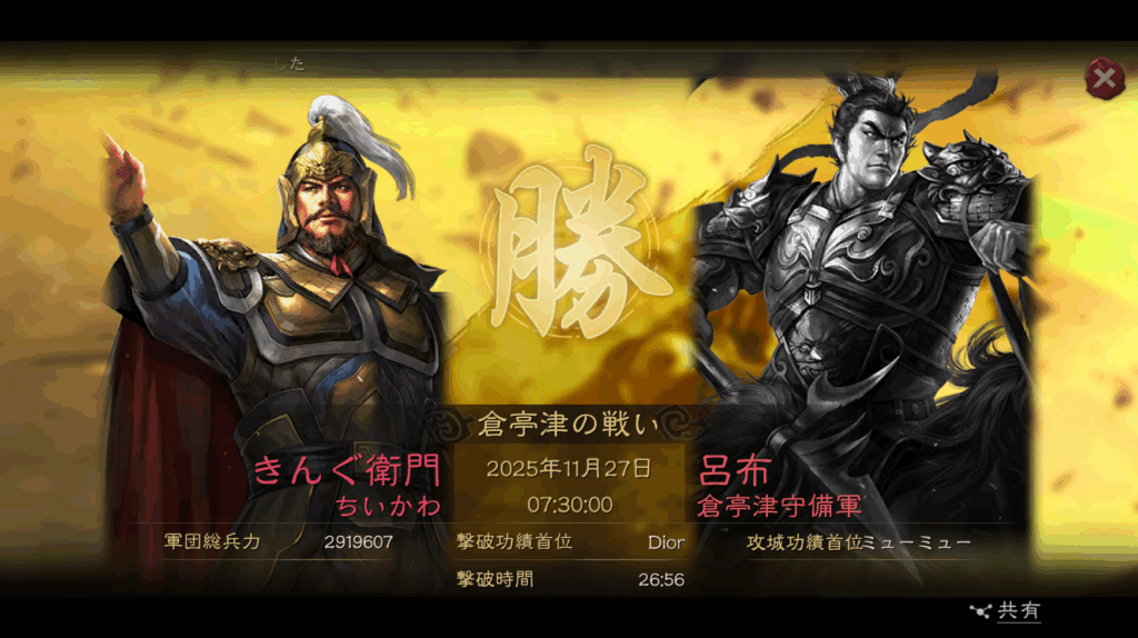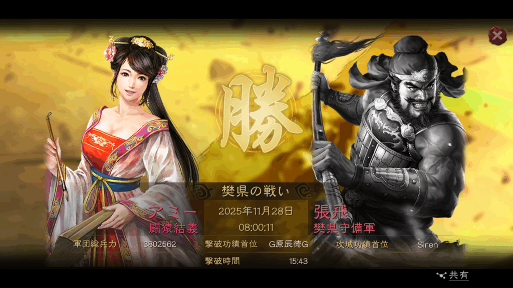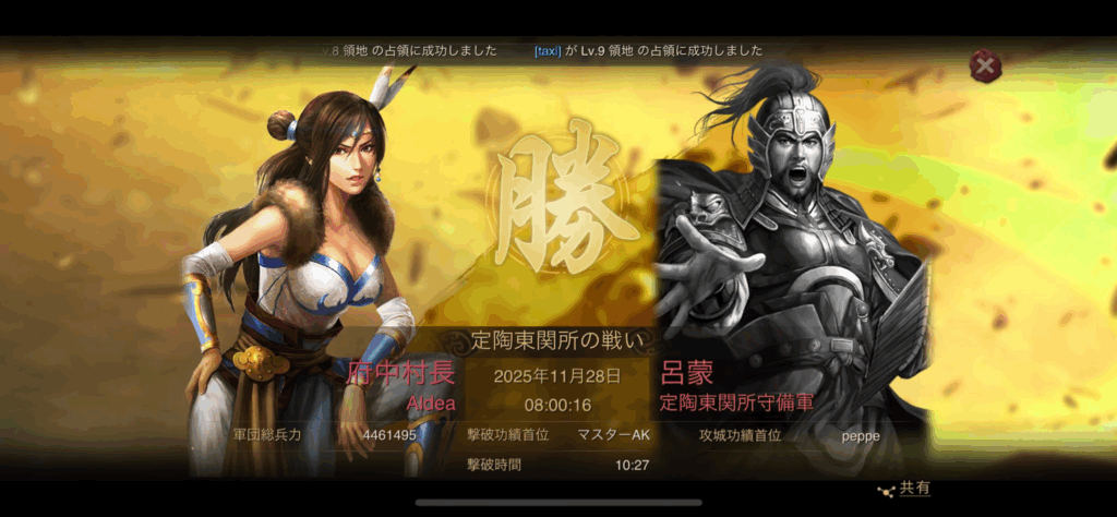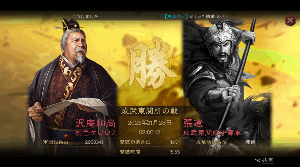 11月28日の同日、同時刻に、左上の第2資源州の関攻城を、呂布陣営のAldeaが攻略しました。