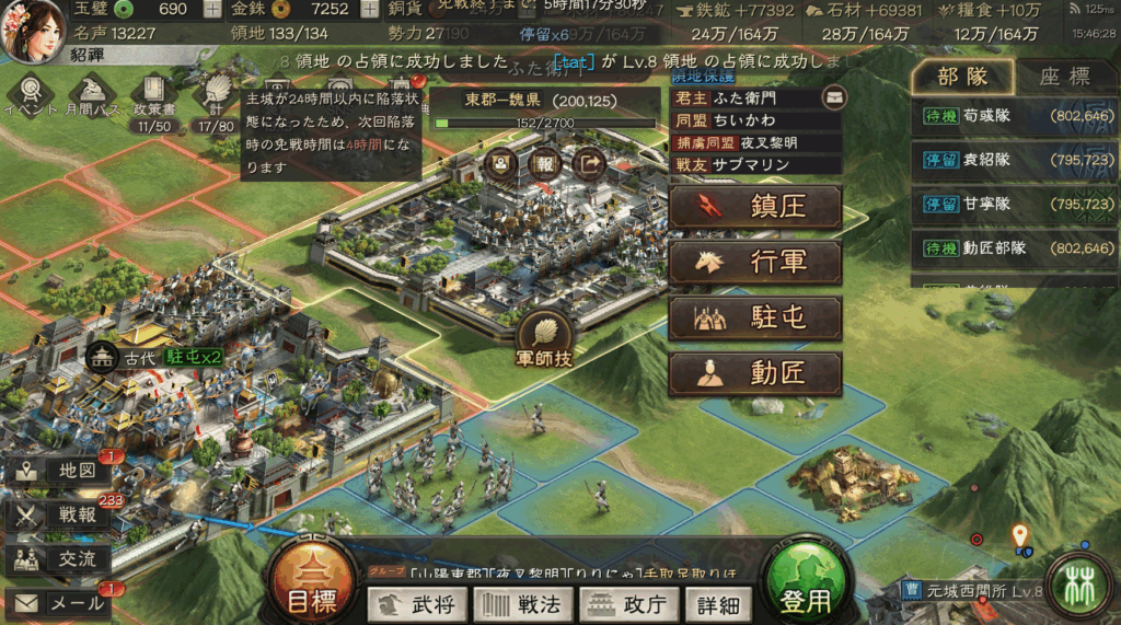 そのまま、11時までの間に、戦法をすべて外して、再構築できたので、48時間以内の攻城は、非常にやりやすかったです。