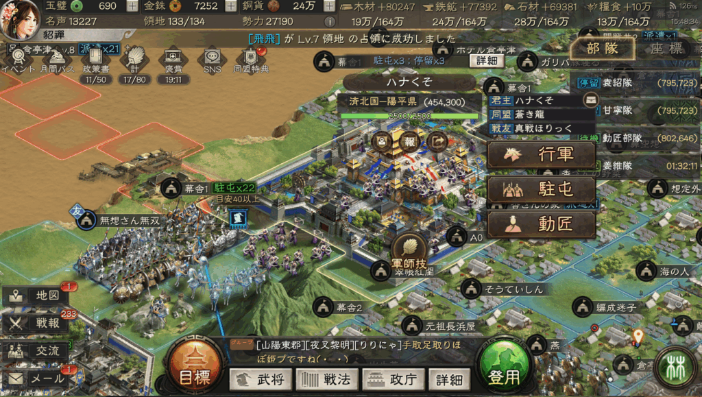 ただ、現状、同盟レベルが39でトップが夜叉黎明となっており、非常に早く、資源開拓、攻城などが進んでいます。