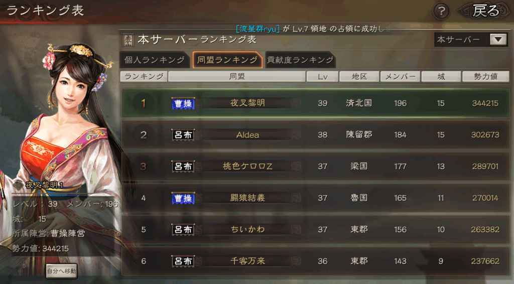 今期の面白いところは、どの同盟も、攻城が結構早くて、曹操陣営の夜叉黎明が15城、同じく呂布陣営のAldeaが15城、以降も2桁攻城している同盟が多く、ペースとしては非常に早い感じがします。
