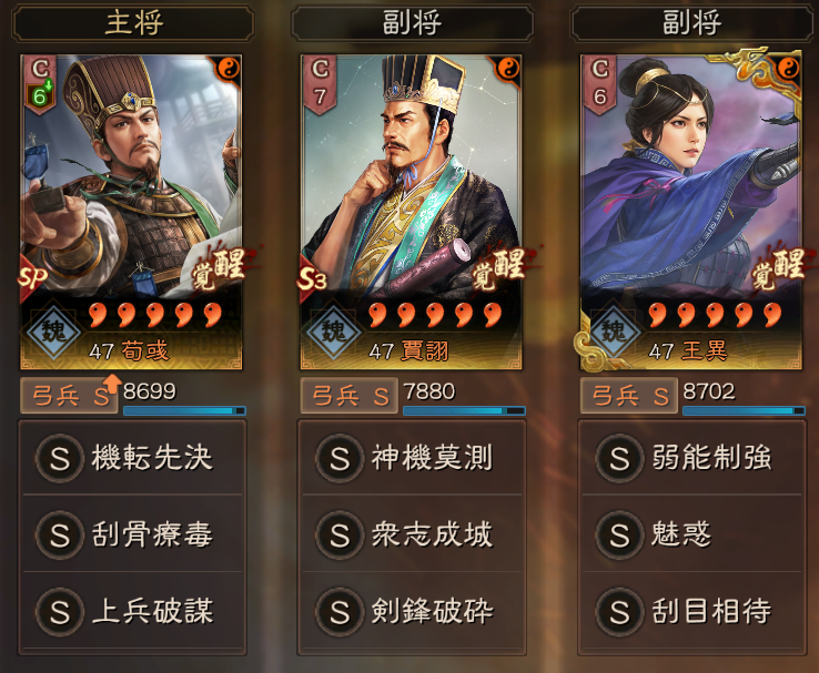 王異弓は、昏迷乱擾・上兵破謀をセットする形が、今まで多かったのですが、破甲呂布などの新しい編成が出てきたこともあり、魅惑をセットした形が増えてきています。