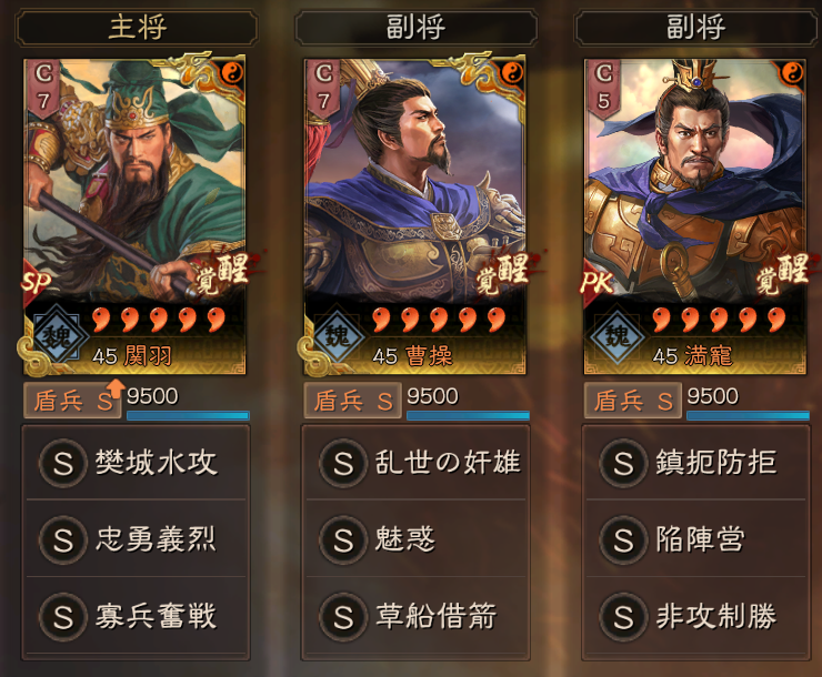 今期も、SP関羽が統軍武将として、採用できるため、魏陣営の盾編成にできます。