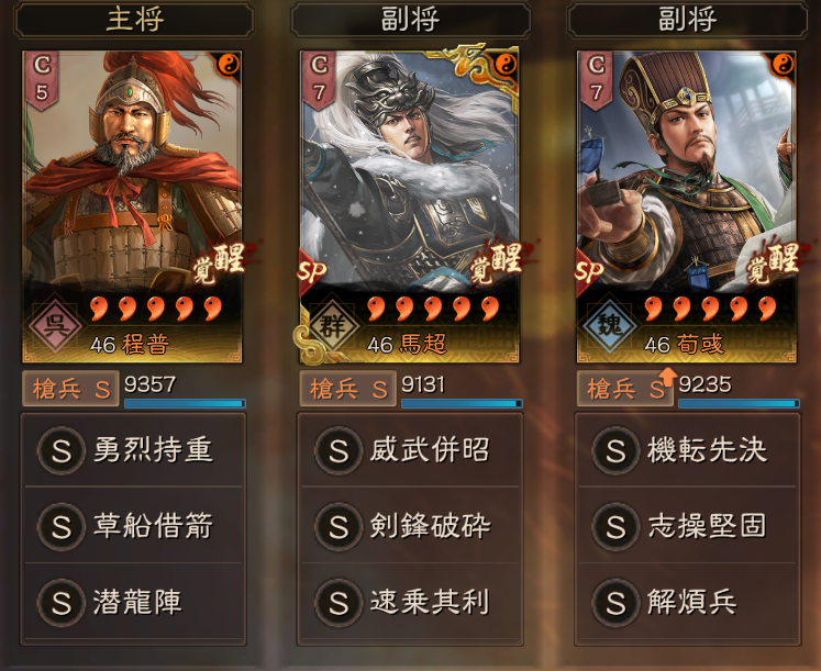火力自体は、少し落ちてしまうため、引き分けが多くなりますが、草船借箭を他の編成でも使えるようになるため、皇馬槍などとも共存ができます。
