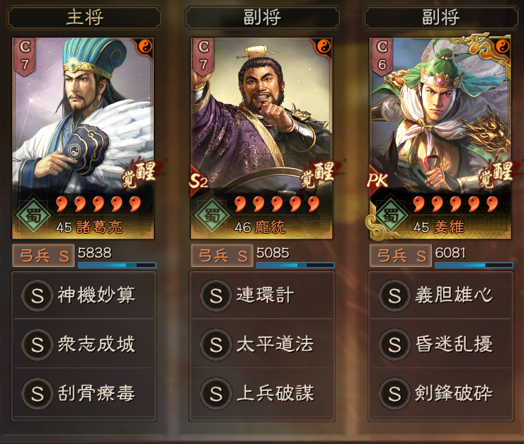 今期は、姜維が統軍武将として使えることもあり、諸葛亮を主将にすることで、主将効果をともに発揮できるようになります。