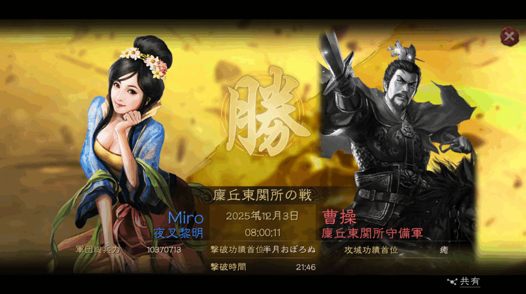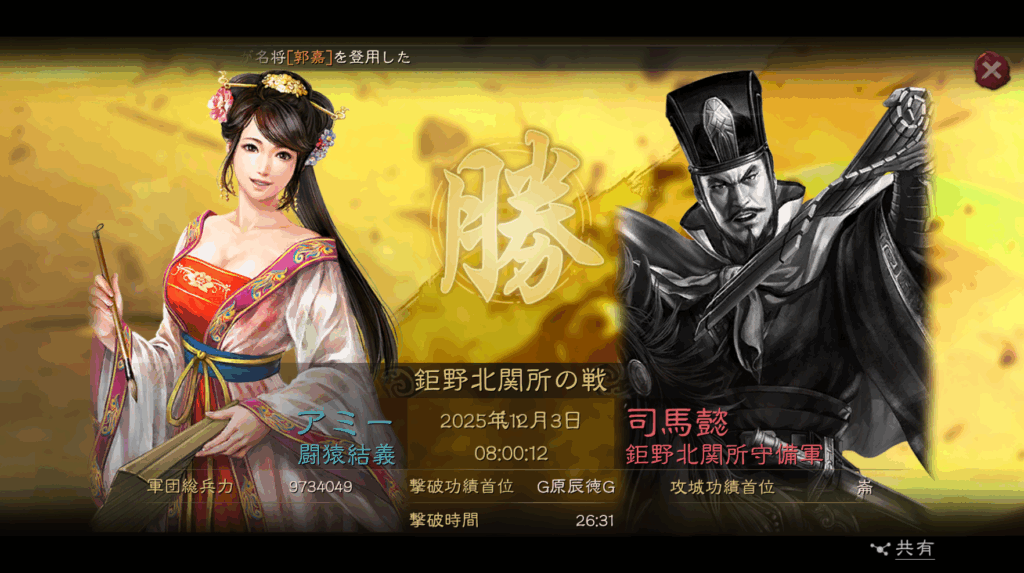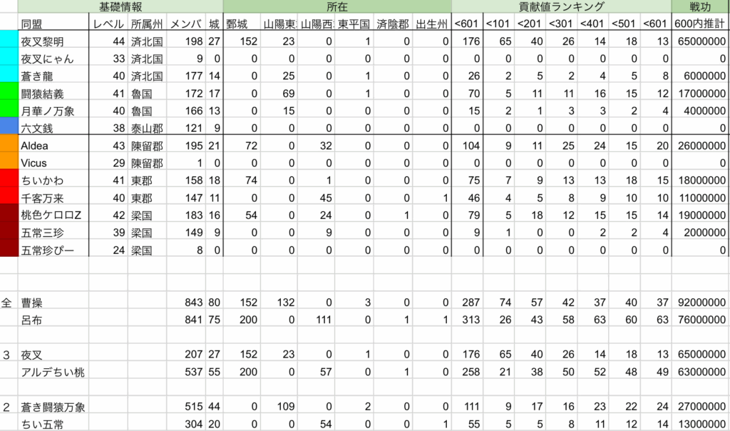 いずれにしても、蒼き龍・月華ノ万象・六文銭の3同盟がある程度、呂布陣営のアクティブ度に近づいていければ、曹操陣営に勝機があるのかもしれません。