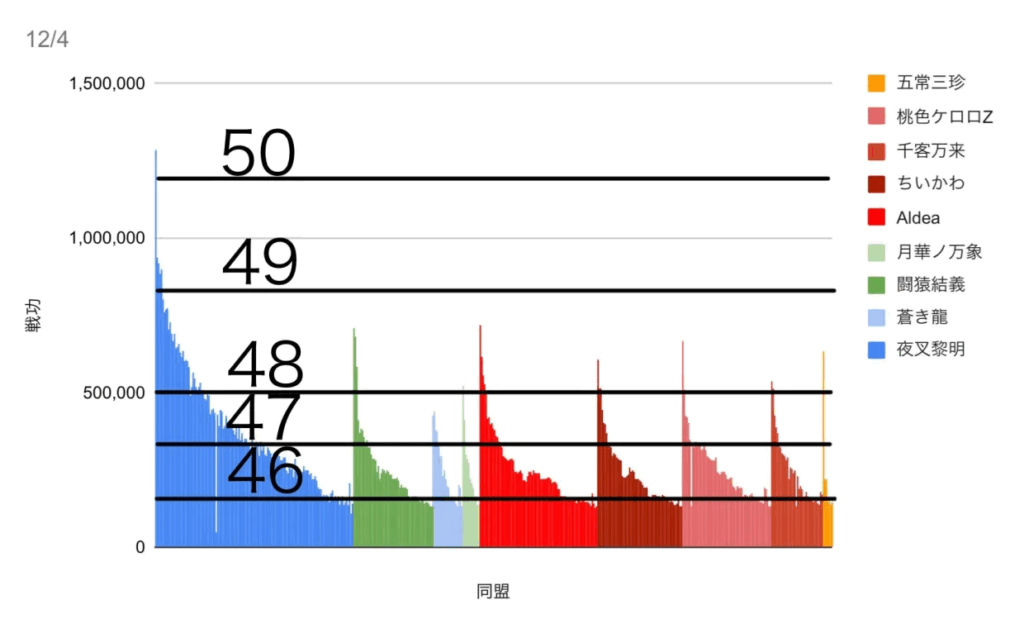 青色の夜叉黎明が貢献度ランキングの高いプレイヤーがレベル50に達しており、獲得戦功も200万といった状況になっています。