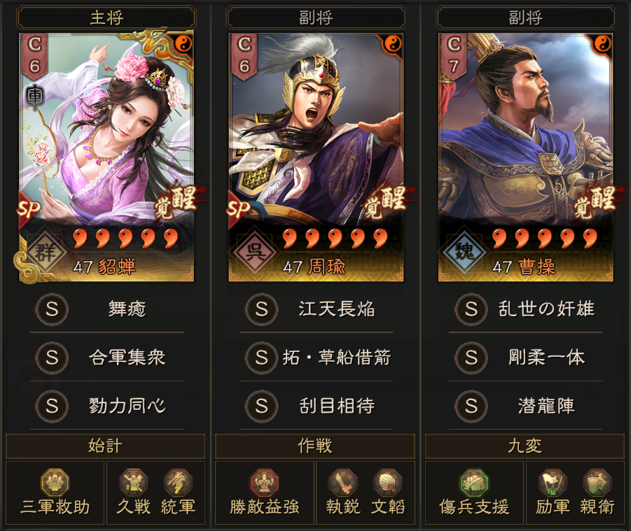 SP郭嘉の知力が、時として800を超えてくるため、今まで以上に富貴騎が使いやすい編成となっています。
