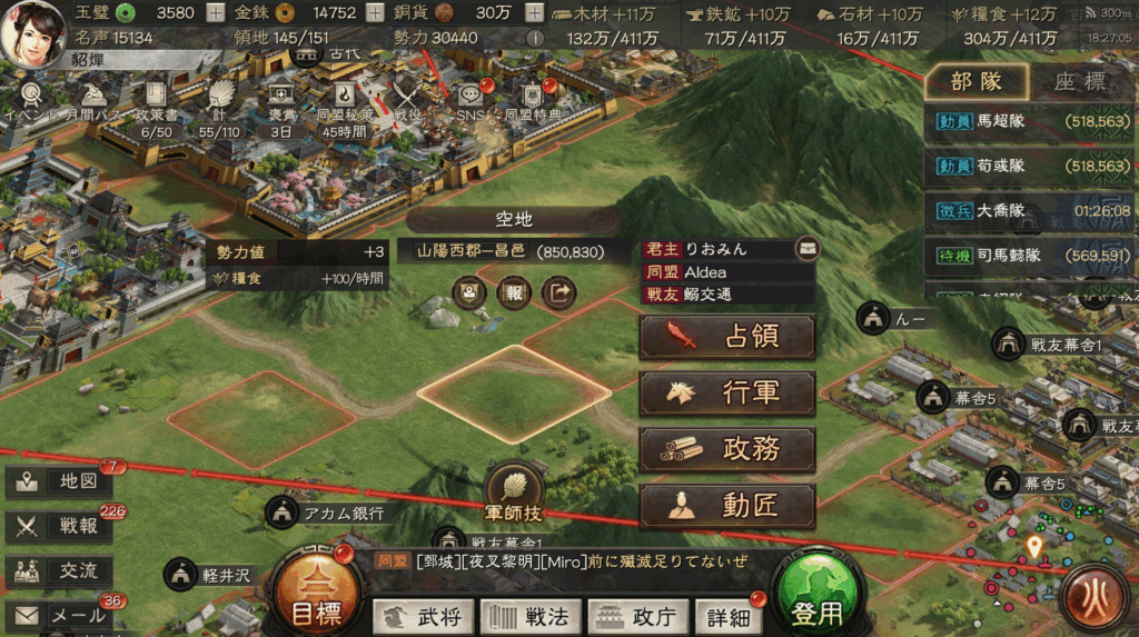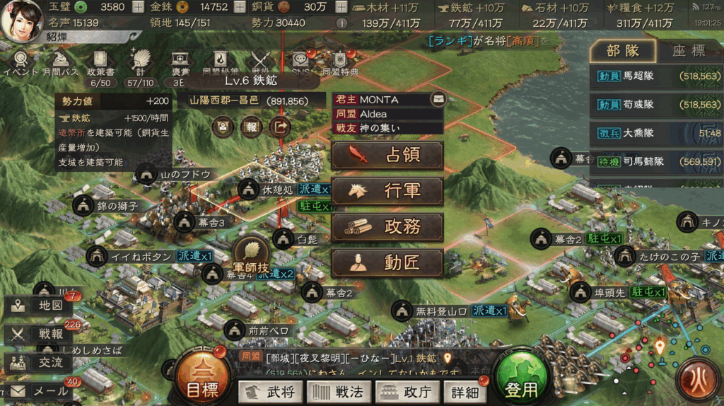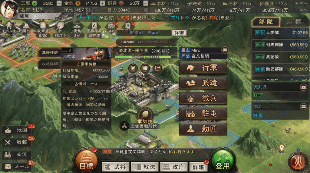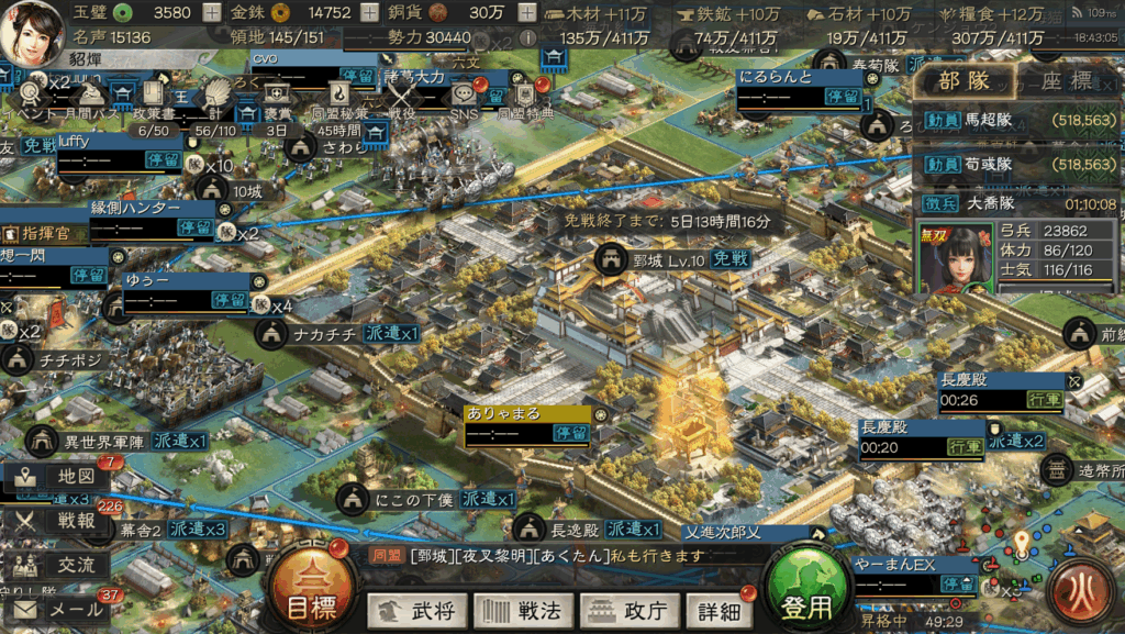 現段階では、中央のレベル10の城の周りは、夜叉黎明が占領している状況ではありますが、まだまだ免戦期間でもあり、この城を取ったとしても、それを決算まで維持するのは、並大抵のことではないと思います。