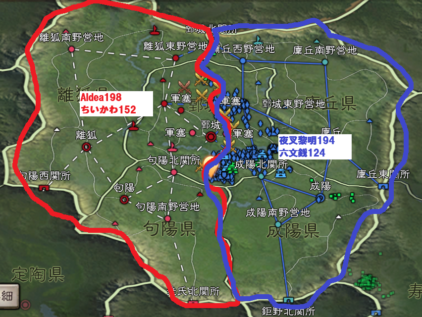 鄄城の60の枠を、呂布陣営の桃色ケロロZ、左上のレベル9の35枠をAldea、左下のレベル9の35枠を同じく呂布陣営の千客万来、対して、右上のレベル9の35枠を曹操陣営の夜叉黎明、右下のレベル9の35枠を曹操陣営の闘猿結義が持っている状態です。