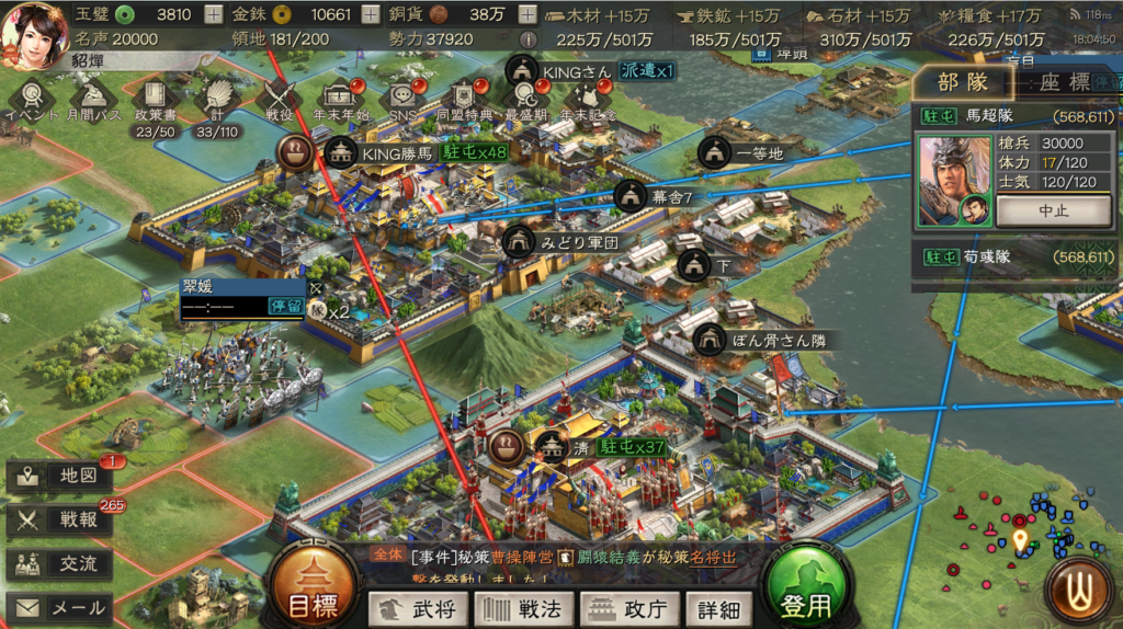現段階では、第3資源州、第2資源州の北、第2資源州の南と、全方面で曹操陣営が劣勢の展開になっています。
