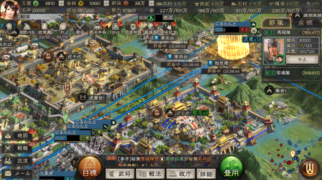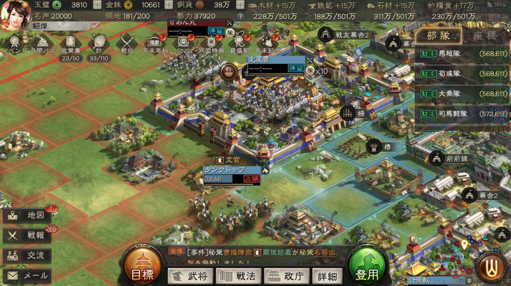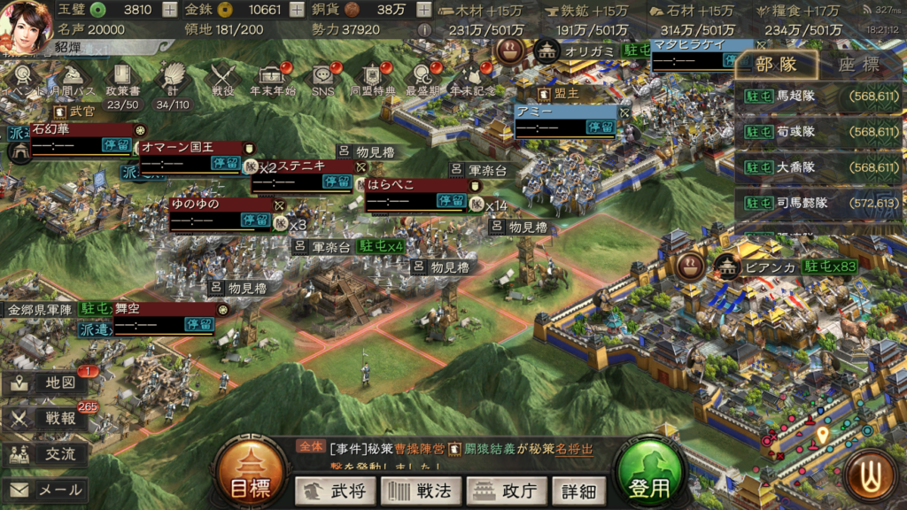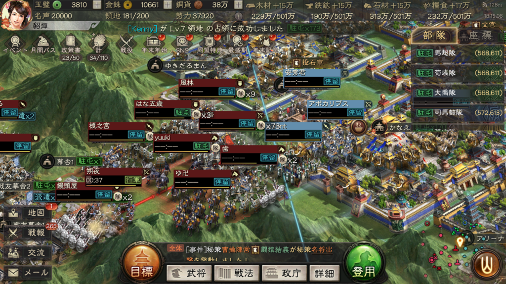 現状、10部隊で戦っていて、支城の軍営や協力施設を上げ終わったので、6軍で群弓、皇馬槍を作っている最中です。