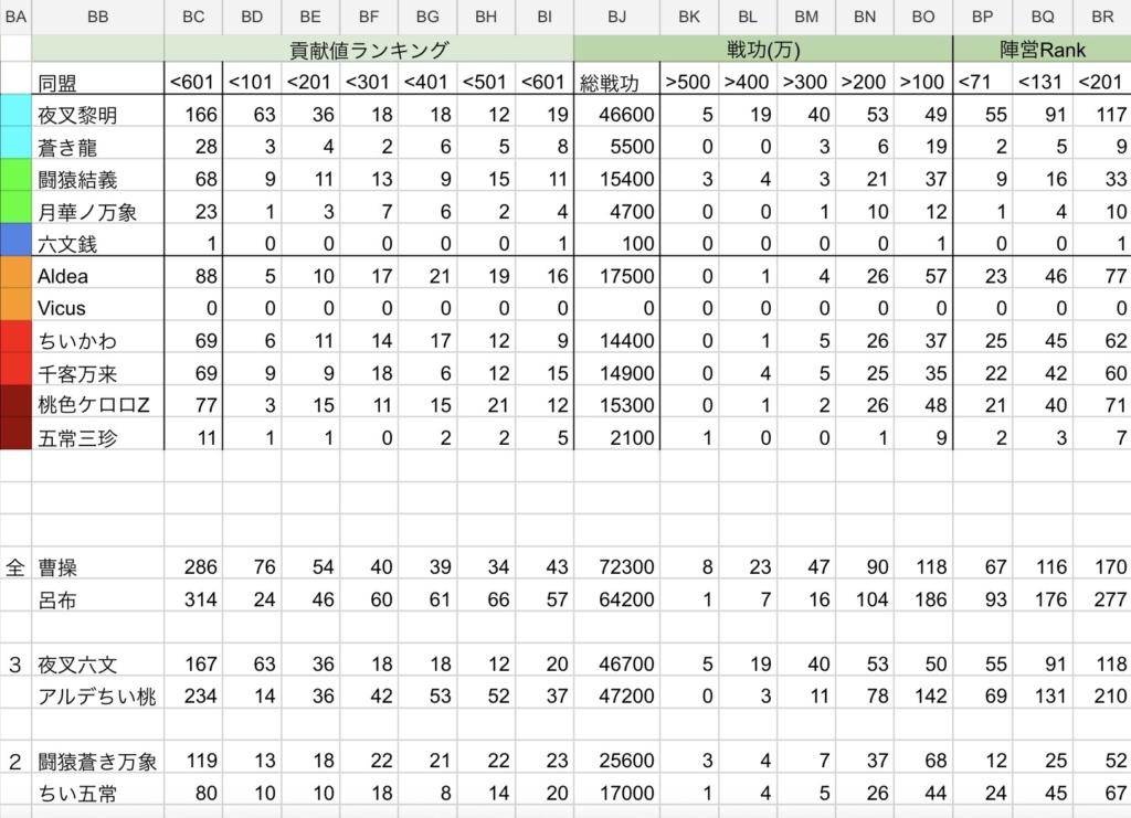 相変わらず、夜叉黎明にアクティブなプレイヤーが偏っている曹操陣営と、どの同盟もバランスよくアクティブなプレイヤーがいる呂布陣営という構図は変わっていません。
