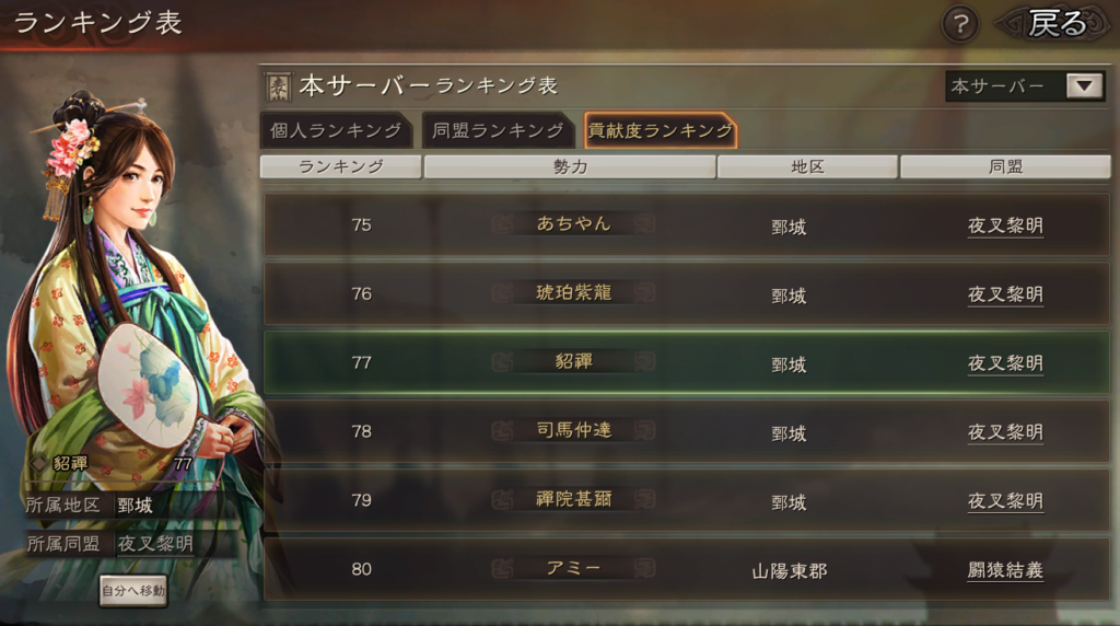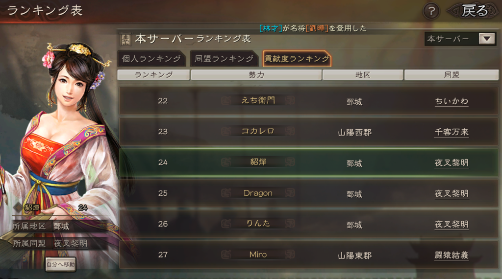 相変わらず、千客万来が呂布陣営の4番手同盟という位置づけにもかかわらず、陣営で最多の9名となっているため、トッププレイヤーが多いことが分かります。
