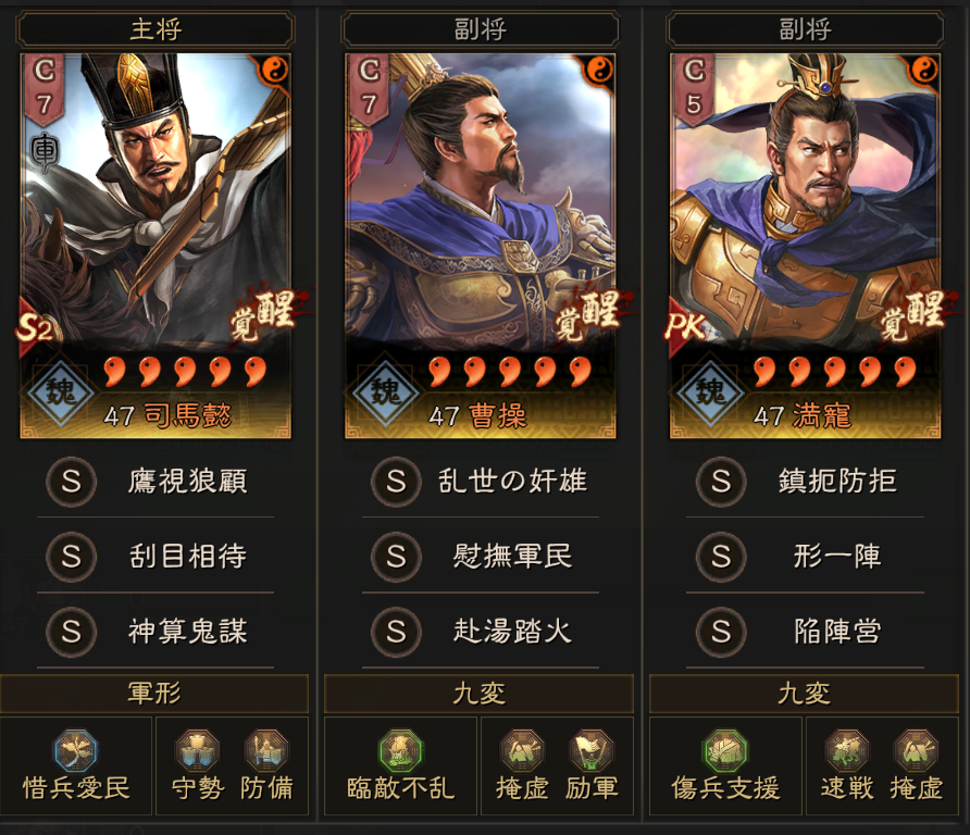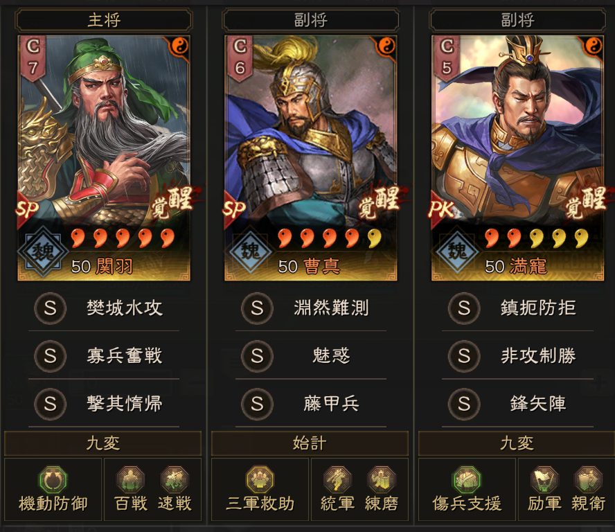 4軍が大尉盾となっていますが、戦法が足りず、魅惑・鋒矢陣・刮骨療毒が足りず、それぞれ代替戦法になっています。