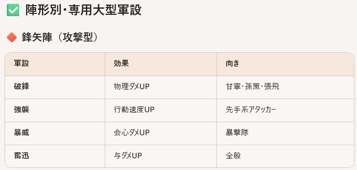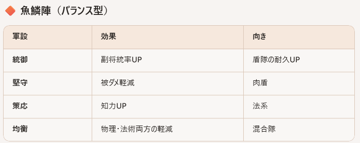 軍設は魚鱗陣の中から、好みのものを選ぶのが良さそうです。