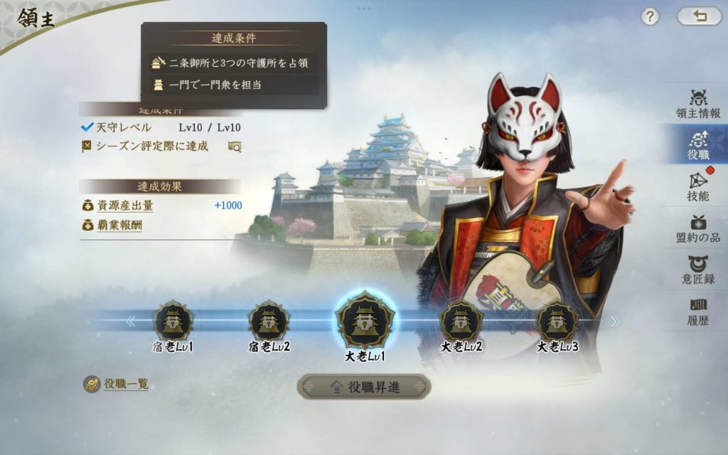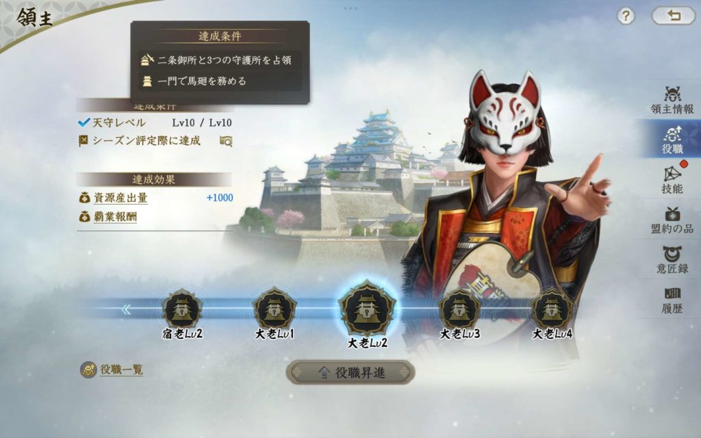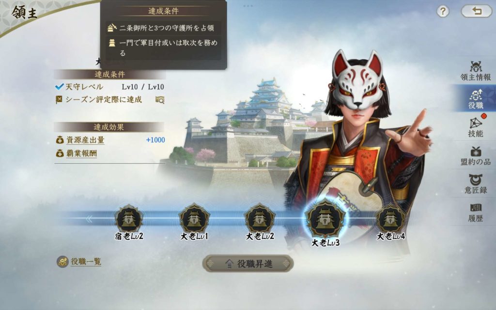 大老になるためには天守がレベル10はもちろんのこと、「二条御所」と「3つの守護所」を取得していることが条件です。一門衆か役職ありか、役職の種類などによって、レベルは変動し、大老にはレベル1からレベル4まであります。