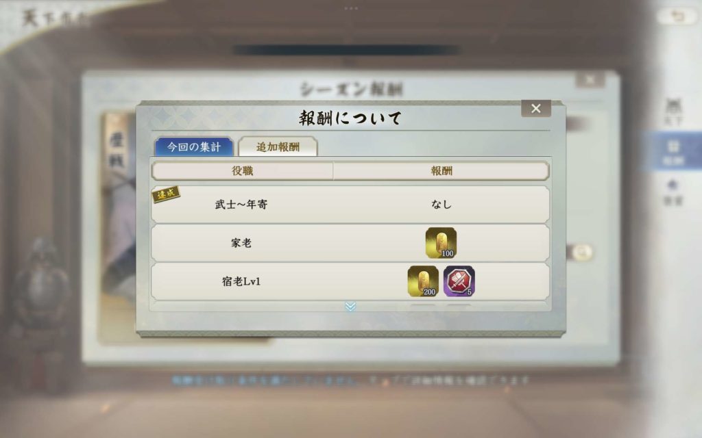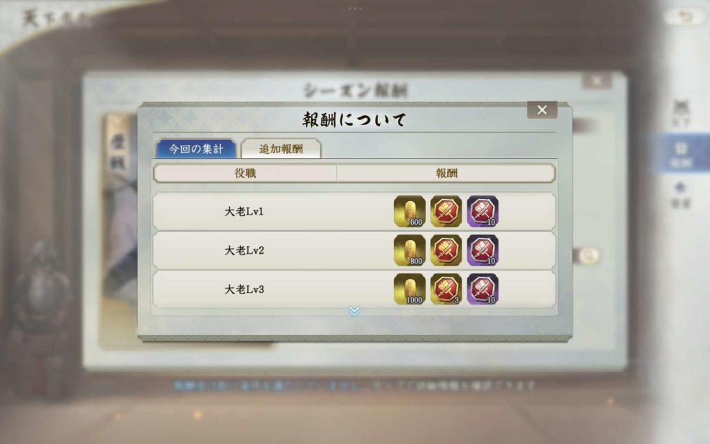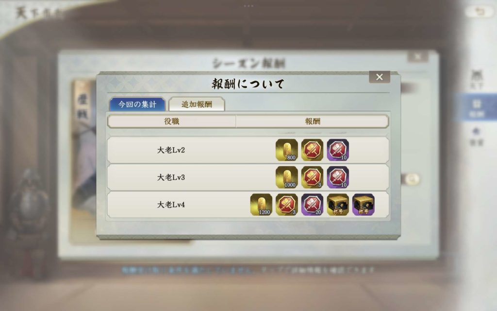 そのため、負け側であっても、どんな状況下であっても、天守レベルは10に上げておくことで、報酬の獲得自体は可能となります。