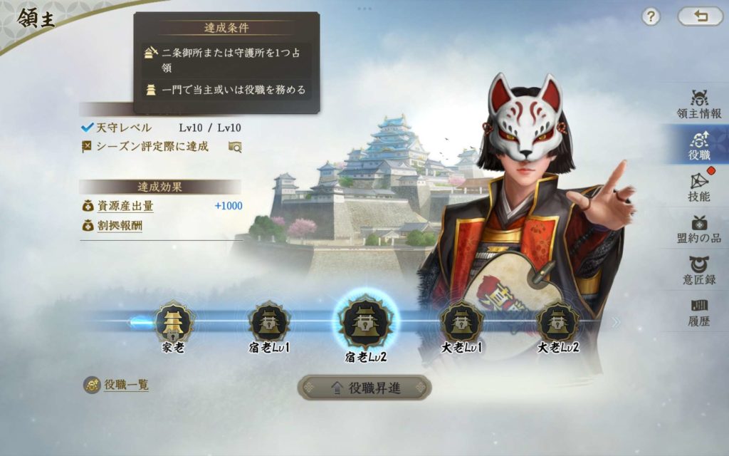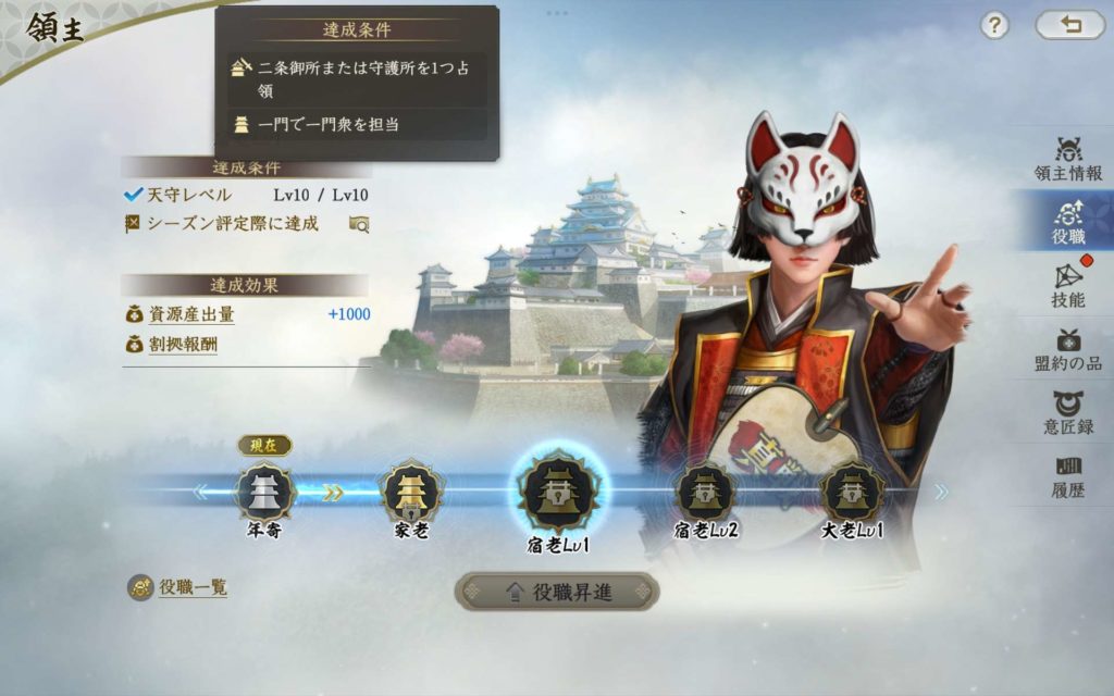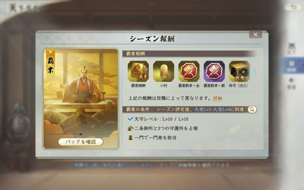 宿老レベル1は、天守がレベル10になっていることのほかに、「二条御所」または「守護所」を1つ獲得しており、一門で一門衆を担当していることが条件となっています。