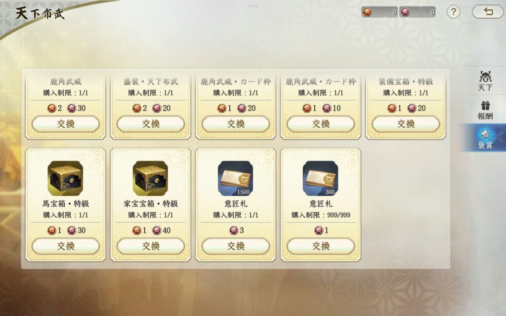 天下布武の盛装が金2個、銀20個、鹿角武威のカード枠が金1個、銀10個、二回目は金1個、銀10個で交換可能です。