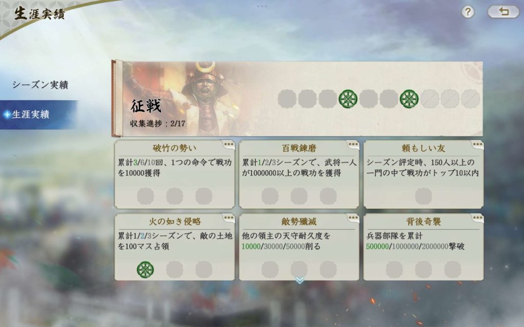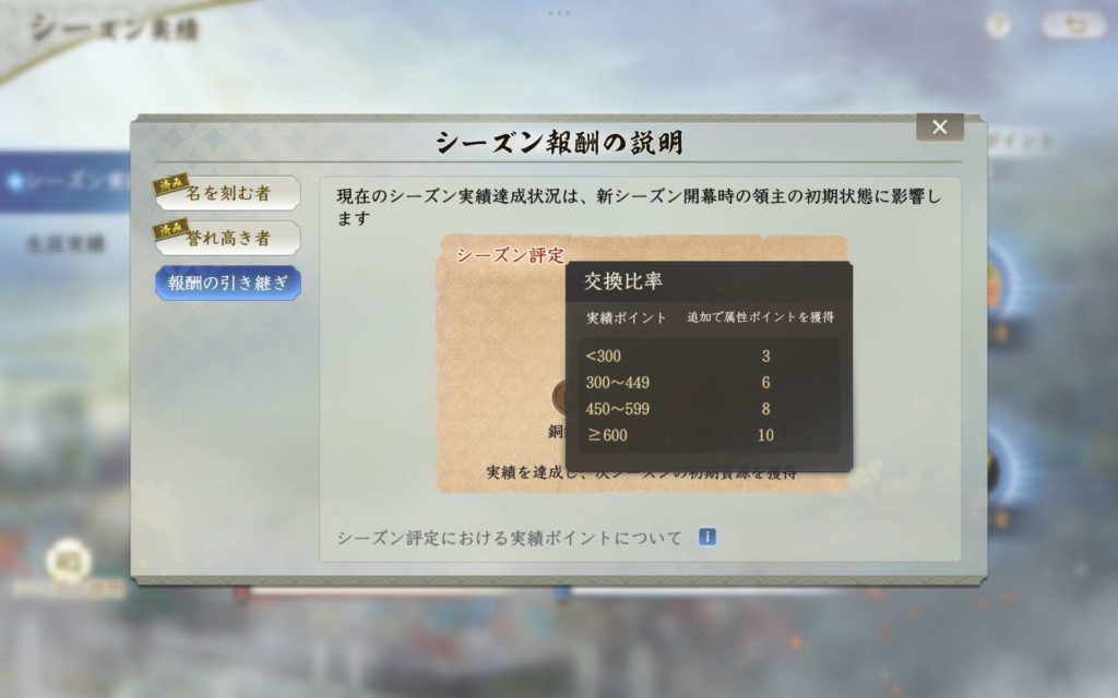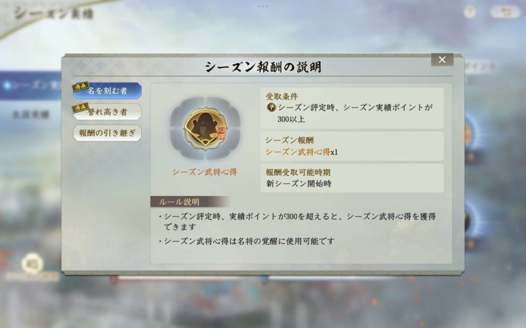 シーズン実績ポイントが300を超えると新シーズン開始時に、シーズン武将心得を獲得できます。