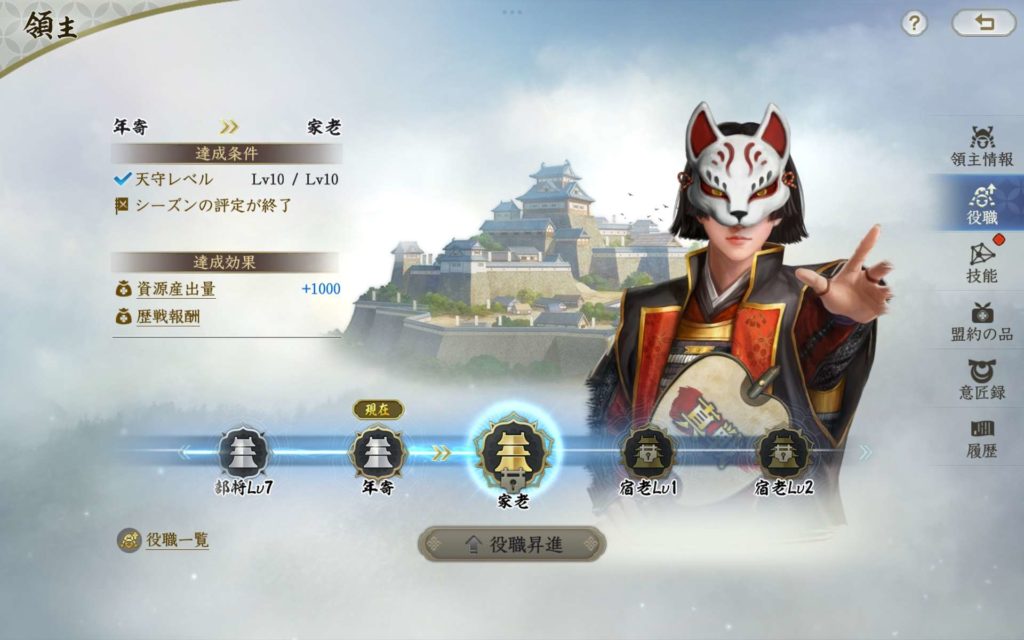 家老の条件はシーズン評定が終了する、天守レベルが評定時に10になっていることです。